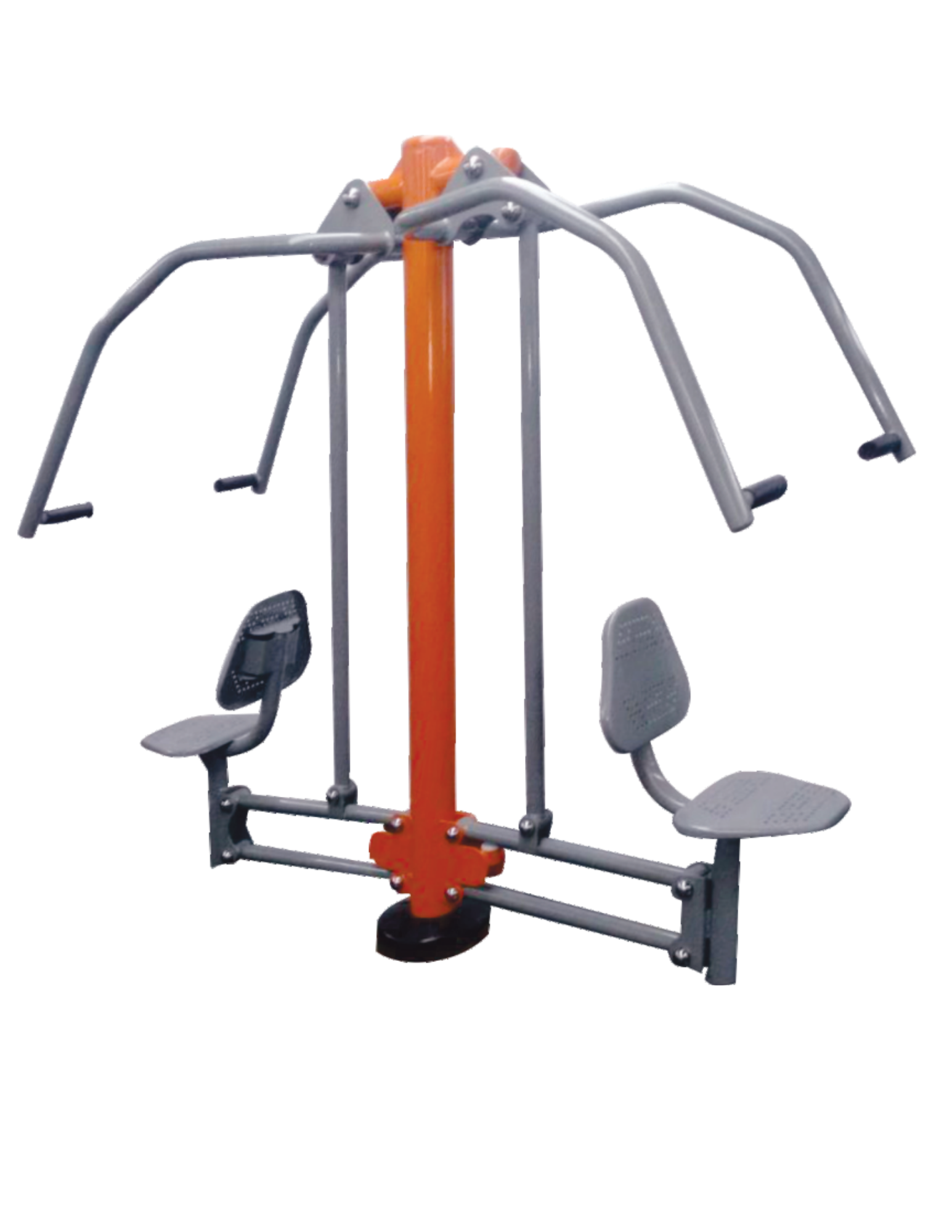 Siéntese y apoye la espalda en el respaldo de la silla, agarre las manijas en cada mano. Luego hale de ellas hacia el pecho en forma simultánea y vuelva a la posición inicial.